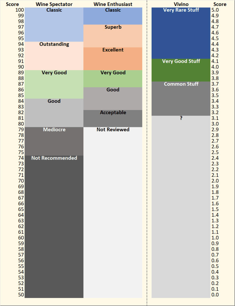 I mentioned that most of the wines I buy are $20 or less, and that I have developed my own compass for those purchases. But, I do frequently splurge $50 (or more!) to get a bottle I’m really curious about. For those splurge purchases, I’m virtually blind and rely on the expertise of others to “advise” or “guide” me. Wine scores are one of the resources I use to make those splurge buys. The sources I consult most regularly are Wine Spectator (WS), Wine Enthusiast (WE), and, increasingly, Vivino (V). There are obviously other sources (Vinous, Wine Advocate, Suckling, etc.) that I have little-to-no experience with, but for the wines I buy, WS, WE, and V offer good coverage of reasonably available wines that I’m interested in, so I focus on them [1].