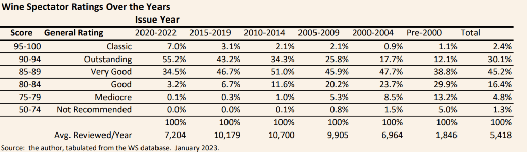 - One non-difference: WS scale starts at 50, while WE does not review wines below 80. But, in fact, WS scoring in practical terms doesn’t use the 50-80 part of the scale anymore—in 2020 to 2022 issues, WS gave less-than-80 scores to about 0.1% of all wines reviewed (see table). The below-80 category was heavily used by WS in the past (e.g. 18% of wines reviewed got less than 80 scores in years prior to 2000!), but it is essentially unused today.