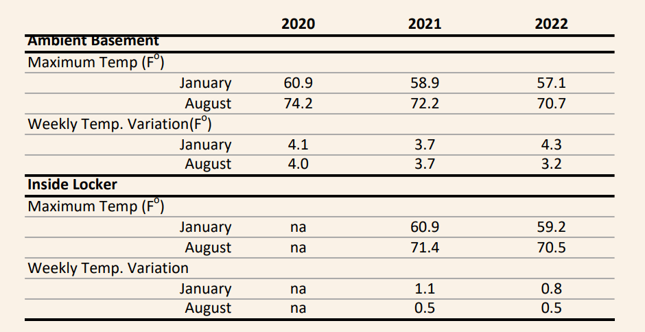 The figure below shows the results of all this. I still don’t have an ideal storage environment–temperatures inside the locker still approach 70 degrees at the peak of the summer. But daily and weekly variation in temperature is very small, less than a degree. And overall range through the seasonal changes of the year is about 59 to 70 degrees (see figure). Too hot to age wines for decades, but certainly enough to hold wines for 5 to 7 years.