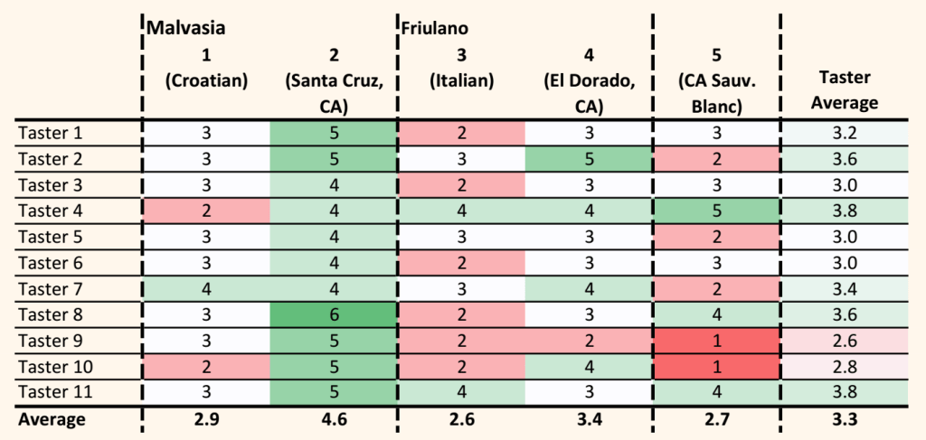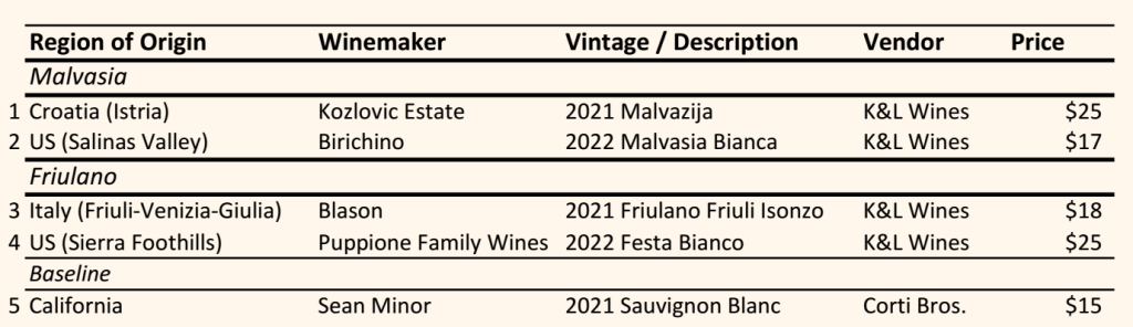 Finding US-produced versions of wines I tried in Italy and Croatia was more difficult than I expected. I tried, and failed, to find them at local brick & mortar retailers. I ended up finding the friulano’s and malvasia’s at K&L Wines in San Francisco (see Post #15 for a comparison of brick & mortar to online retailers). One more familiar wine (a CA sauvignon blanc) was included as a baseline, since few of the tasters had any experience with malvasia or friulano.