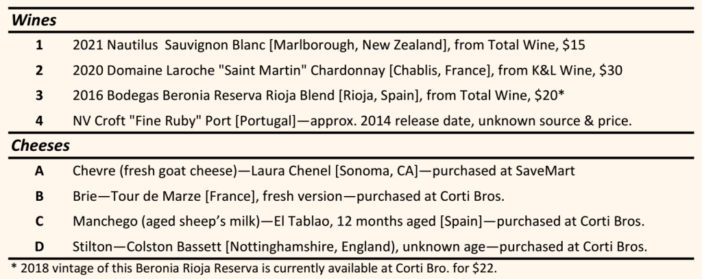 The wines were all from the TA cellar, but all (or their equivalents) were widely available. The port was a minor exception–I had been gifted the bottle years ago, and I am simply out of the habit of drinking port, so I was happy to liberate it at this tasting. More current releases of non-vintage Croft (as well as several others) are easy to find. The array of wines was assembled to include several “classic” wine/cheese pairings, and to give the participating tasters a chance to compare and contrast the wines.