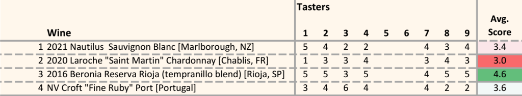 The higher scores fell along the traditional or classic pairings: sauvignon blanc + chevre, brie + chablis, manchego + rioja, and port + stilton. I had a minor concern about biasing the scores by identifying those classic pairings, both in guidance sent out prior to the tasting, and in the scoresheets. Overall, I think the tasting was a bit more productive in terms of learning, though, and lots of people tried, and liked, non-classic pairings. Also, some tasters just liked (or did not like) stilton, the strongest-flavored cheese in the flight. Same for port, both lovers and haters were in the mix, and the scores of tasters reflect that.