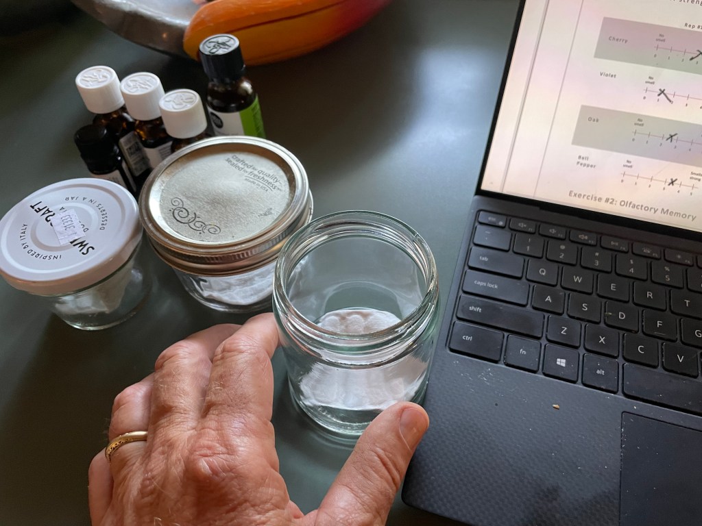 I mentioned in Part 2 that I had been recruited by Frauke Galia, an aromatherapist and smell training coach, to participate in a beta test of her “Smell Gym”. Her concept is to treat the sense of smell as a “muscle” that needs to be regularly trained and exercised in order to stay in shape for the long haul. She developed a set of classes, much like a spin class you would take at a gym, but focused on maintaining and developing your sense of smell. She offers those classes online now. Without divulging too much about the classes, participants pre-prepare scent jars for each class, and those are used in a series of three or four exercises that challenge the sense of smell, and the brain, to experience and process those scents in new ways. I have just started the online classes, and they are fun and rewarding. Each class takes about an hour.